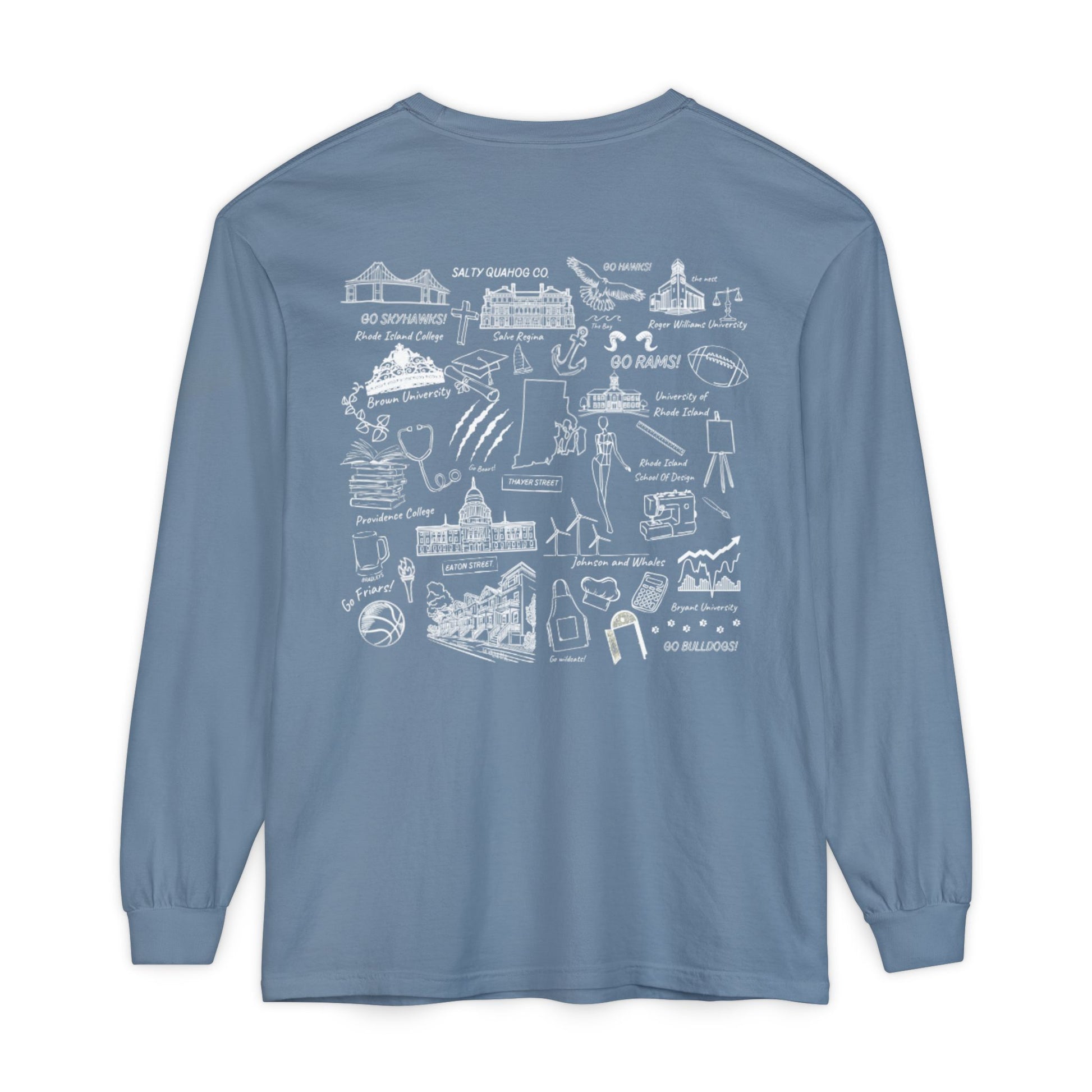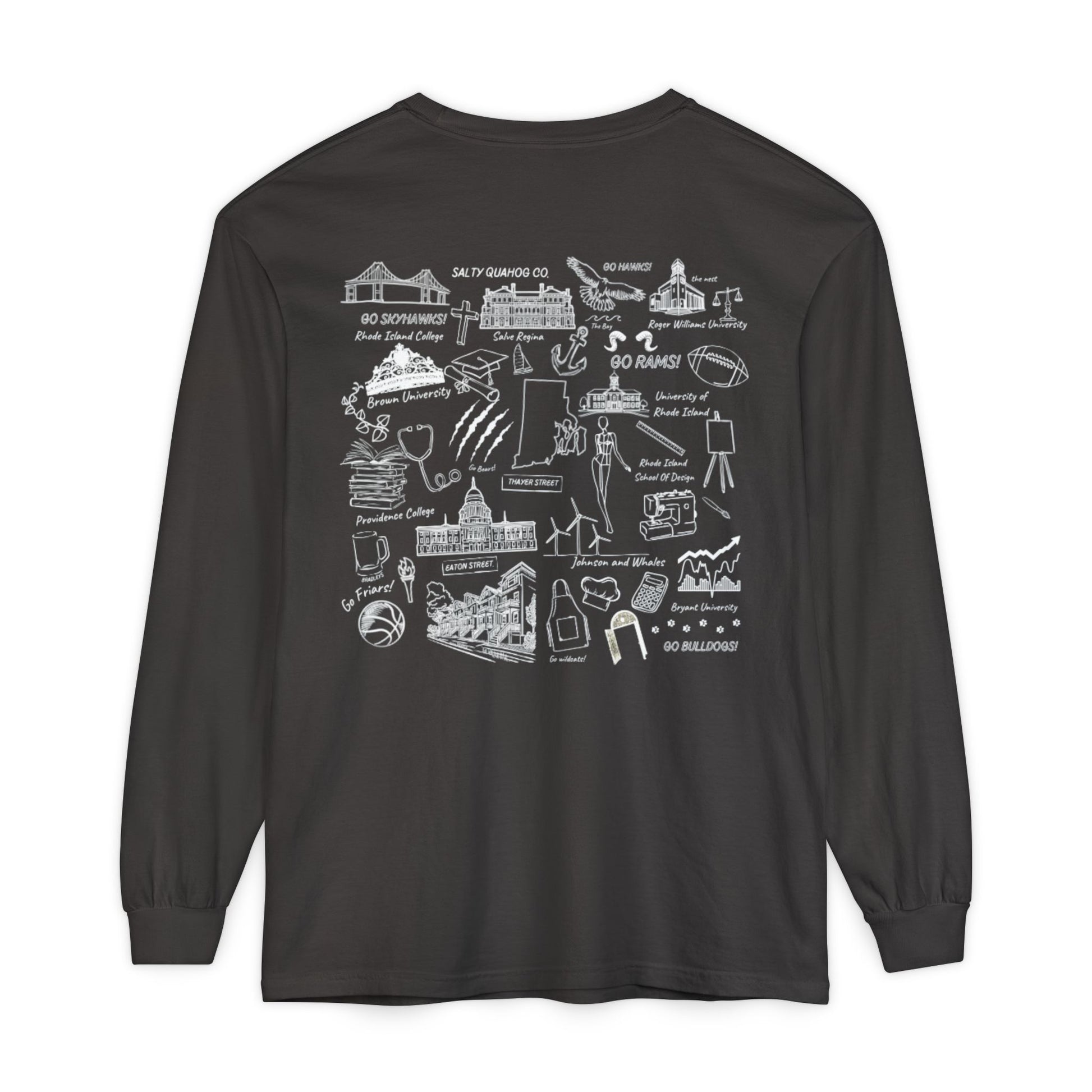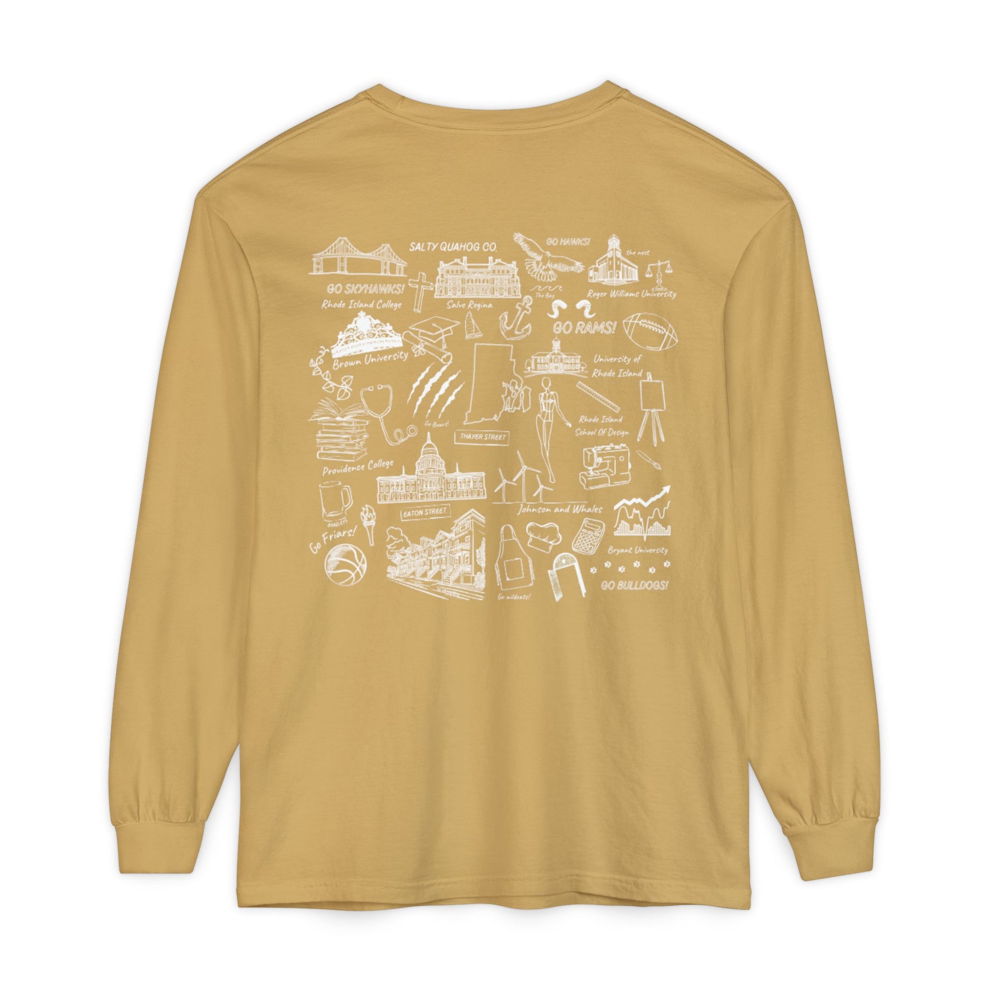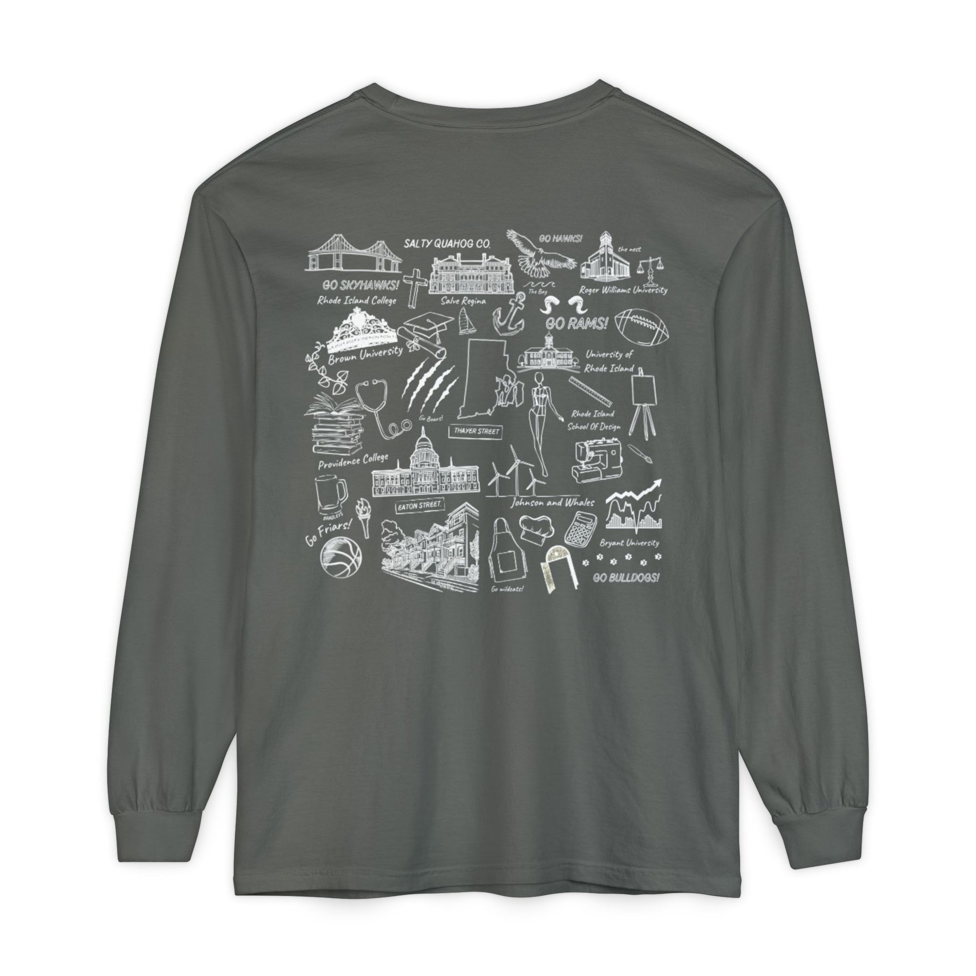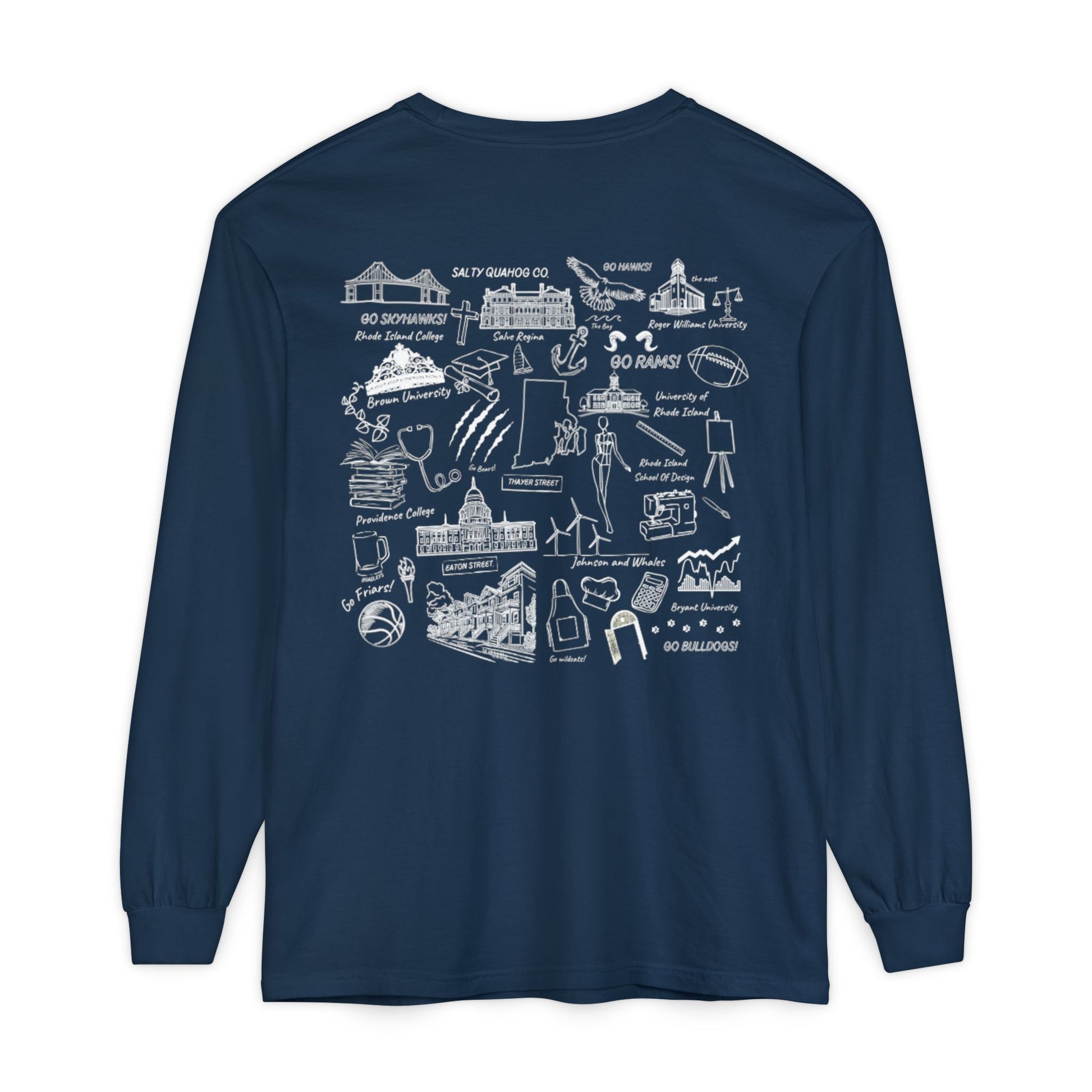 A comfortable and stylish long sleeve shirt featuring sketches of all Rhode Island colleges on the back. Perfect for those who want to show their state pride or support their favorite local schools. Great for casual wear or as a statement piece during college events or reunions.