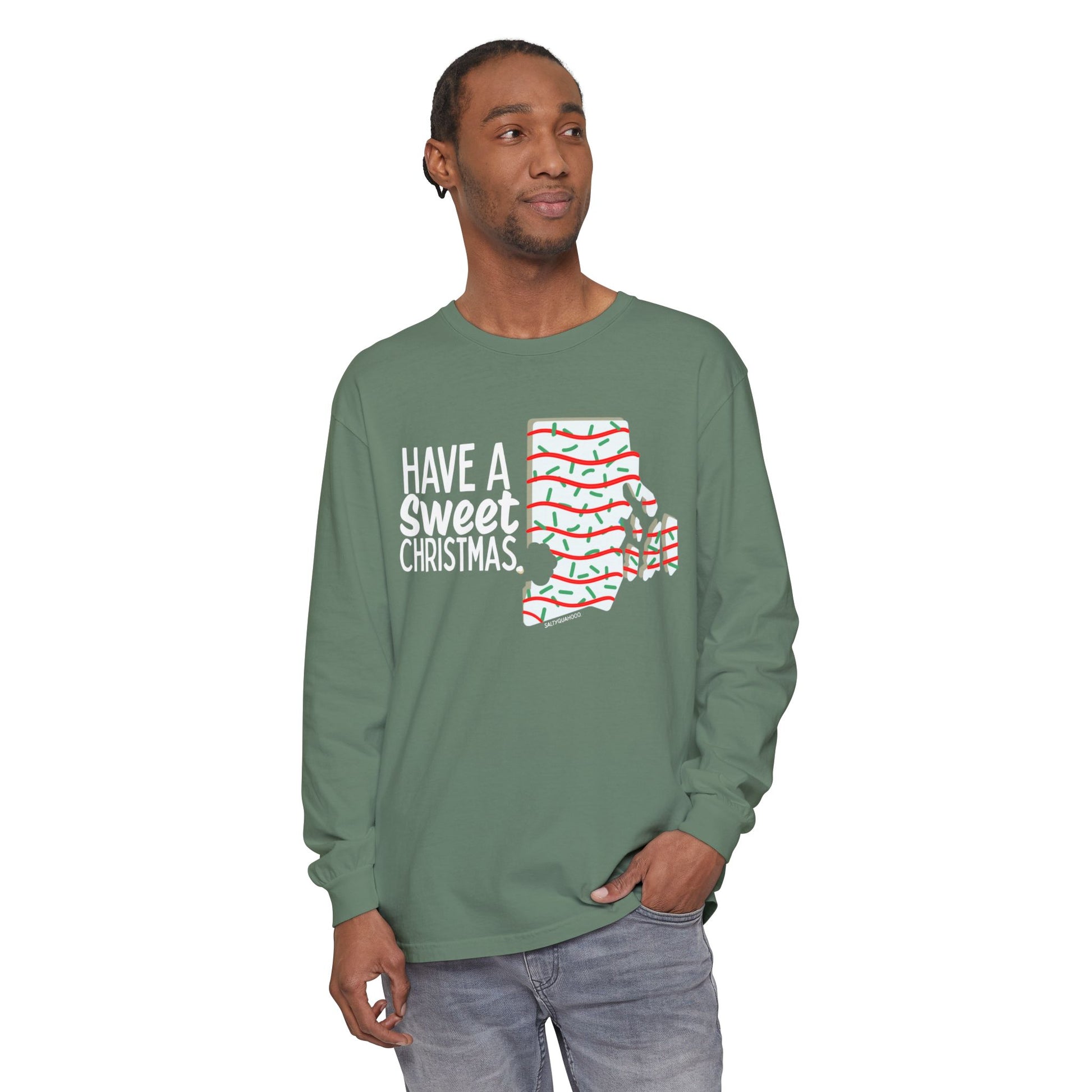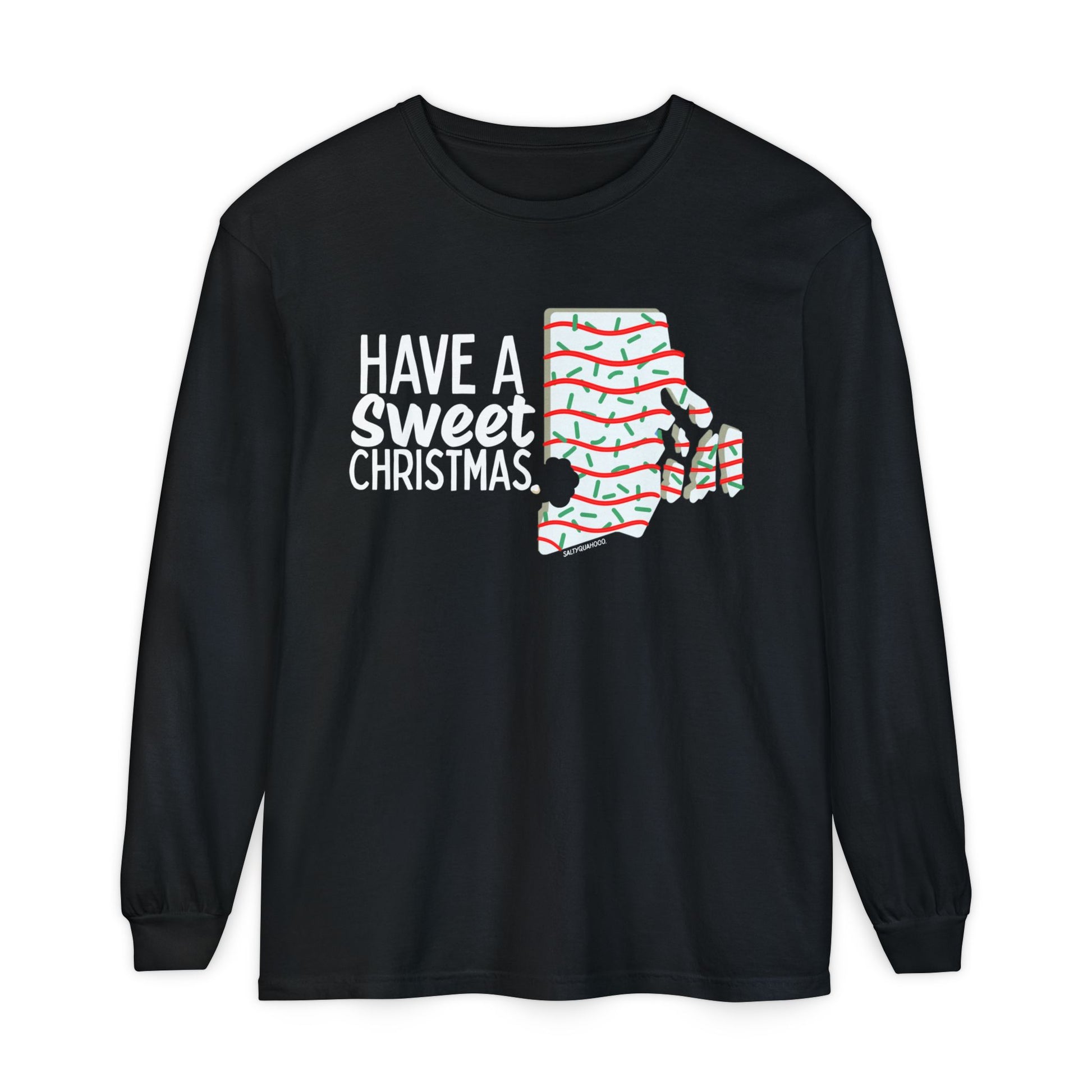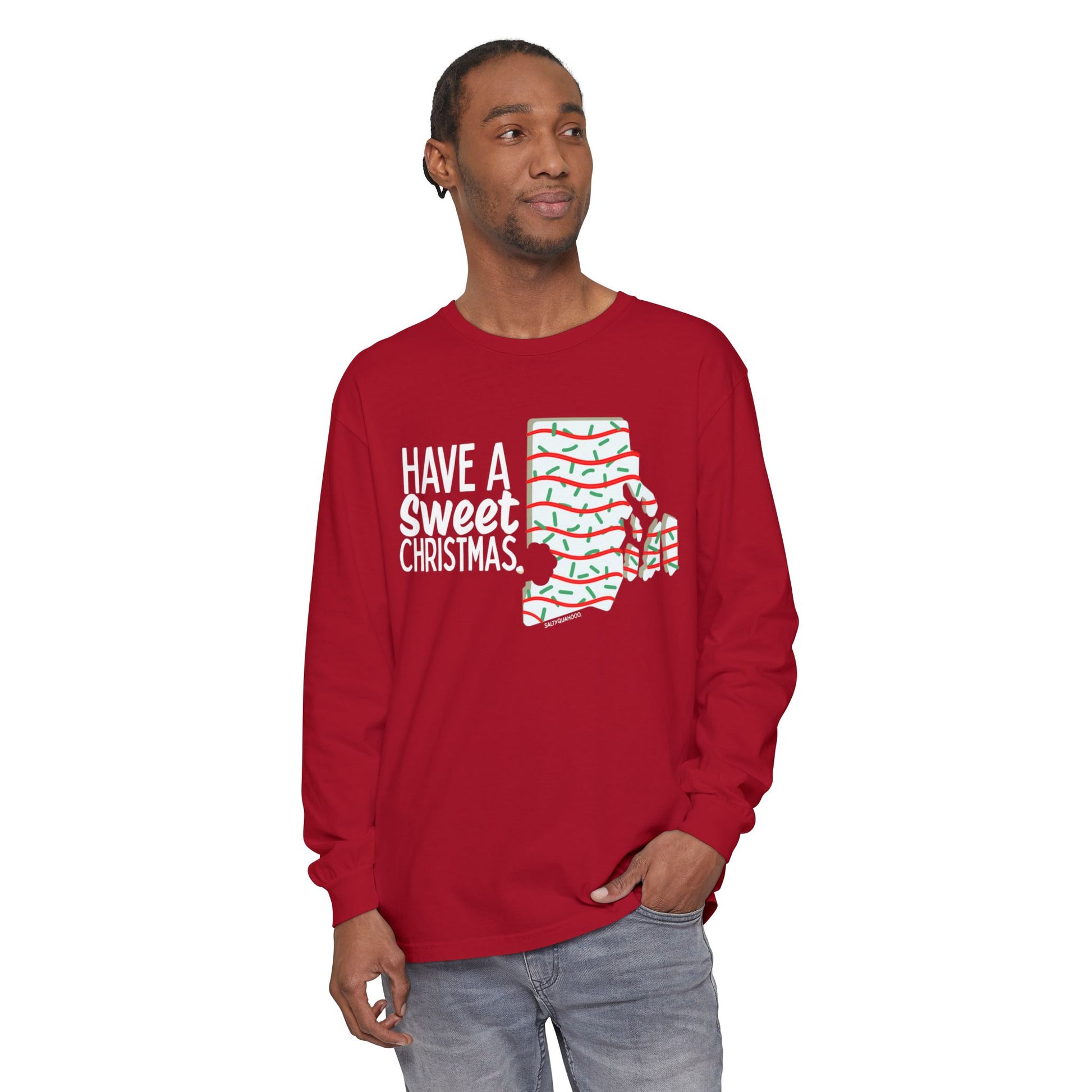 RI Shaped Holiday Cake-This unisex garment-dyed long sleeve t-shirt combines comfort and style for an effortlessly chic look. The soft fabric and classic fit create a relaxed vibe, perfect for casual outings or cozy days at home. Ideal for the holiday season, this shirt embodies a playful spirit with its festive design, making it a delightful addition to any Christmas celebration or seasonal gathering. It's a wonderful choice for friends and family who enjoy unique, statement pieces that reflect their playful personality. Great for gift-giving, this shirt is sure to bring smiles at holiday parties or as a thoughtful present for any loved one!