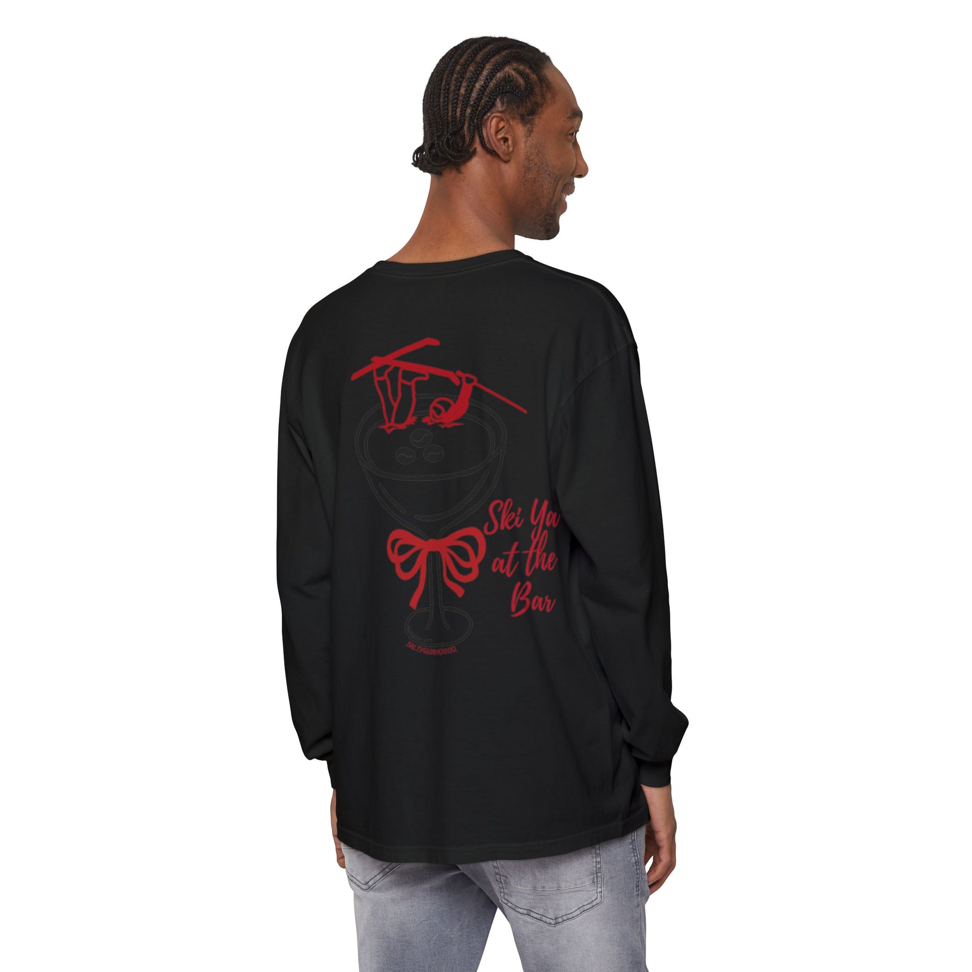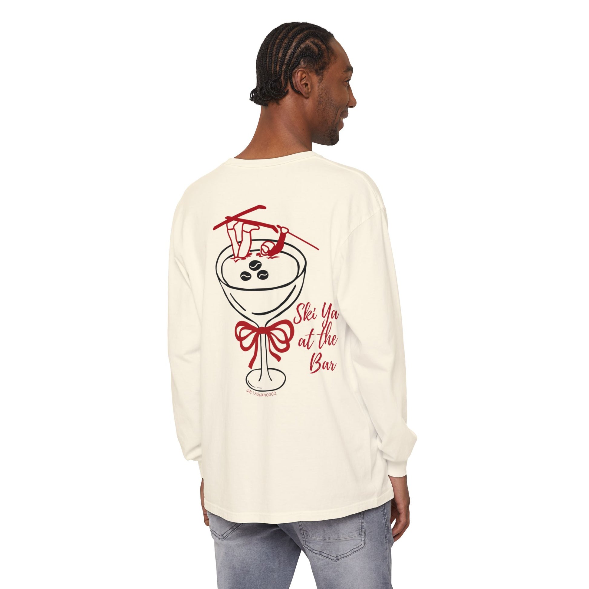 Ski Ya at the Bar-This unisex garment-dyed long sleeve t-shirt combines comfort and style for an effortlessly chic look. The soft fabric and classic fit create a relaxed vibe, perfect for casual outings or cozy days at home. Ideal for the holiday season, this shirt embodies a playful spirit with its festive design, making it a delightful addition to any Christmas celebration or seasonal gathering. It's a wonderful choice for friends and family who enjoy unique, statement pieces that reflect their playful personality. Great for gift-giving, this shirt is sure to bring smiles at holiday parties or as a thoughtful present for any loved one!