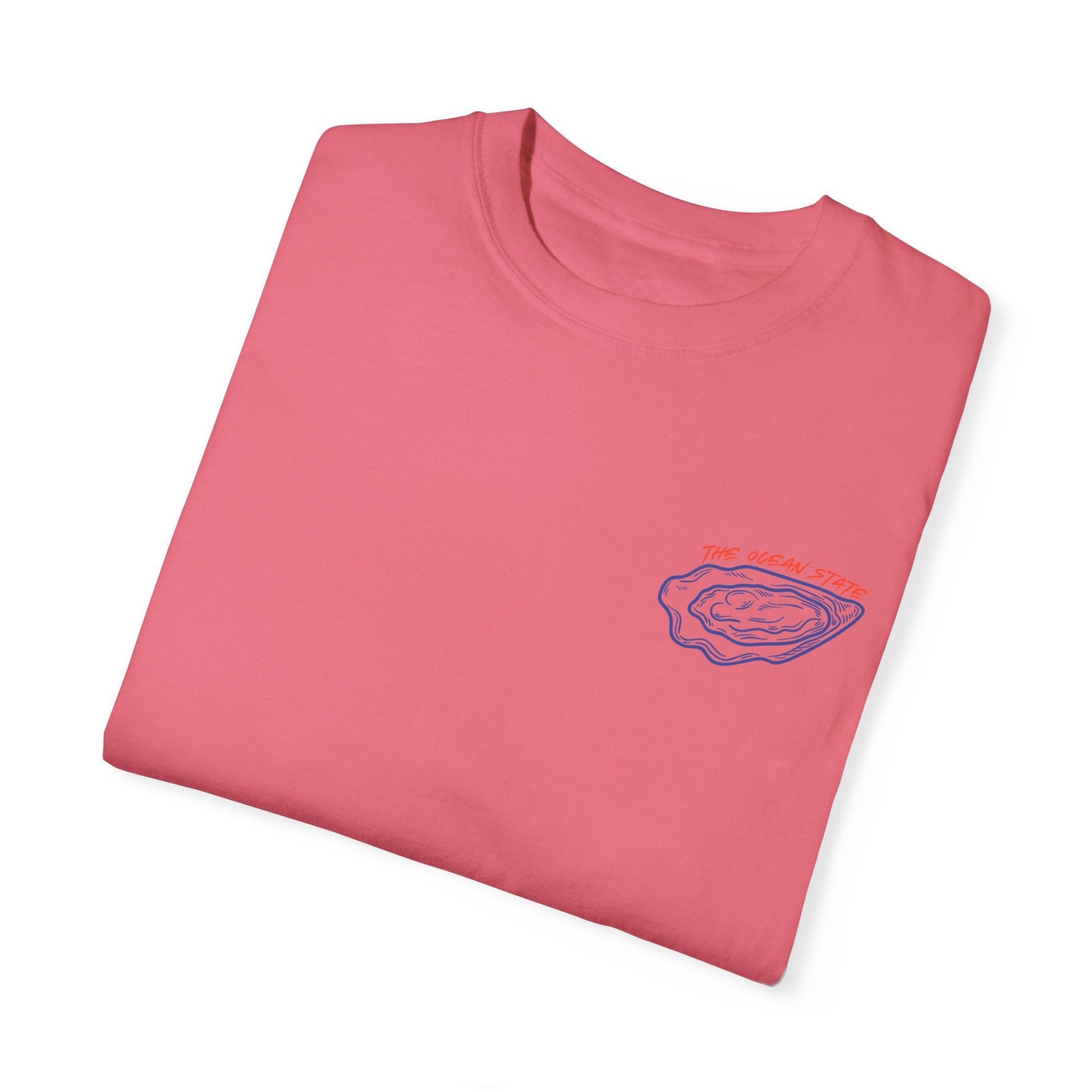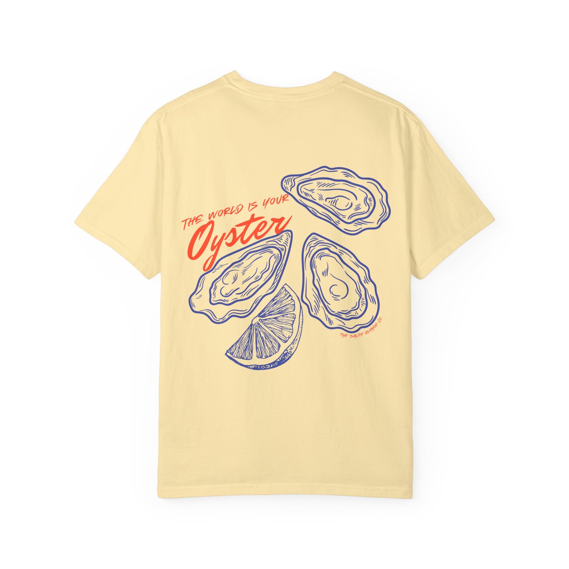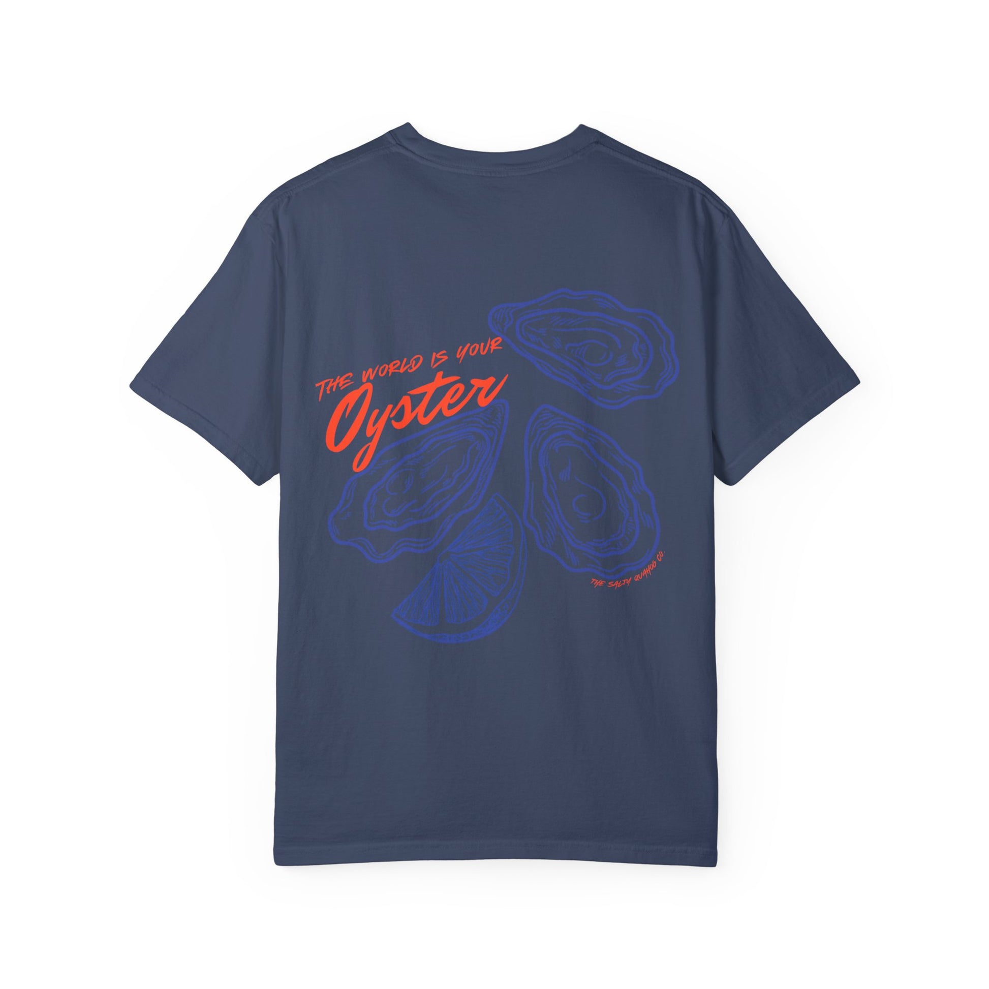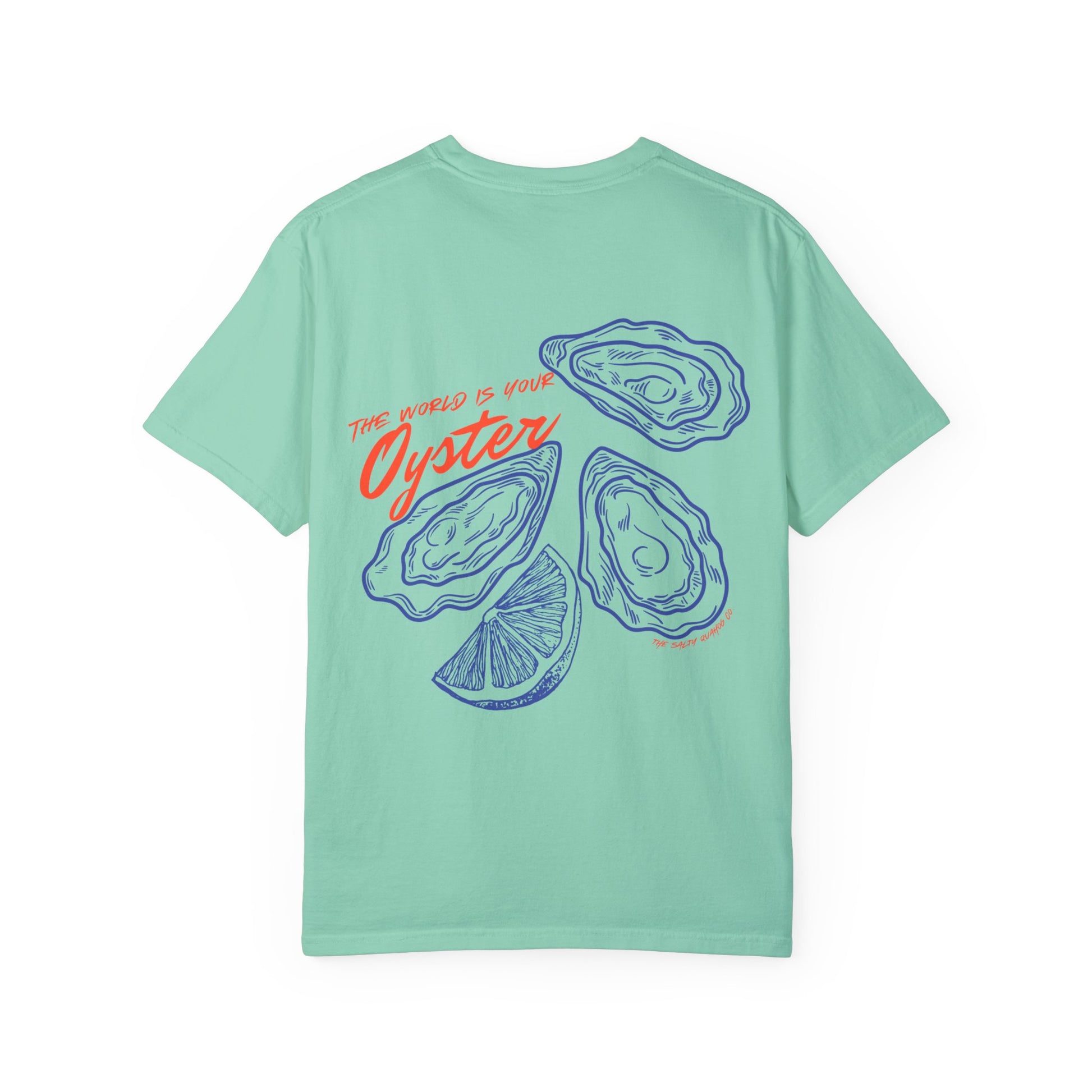 The World is your Oyster T-shirt is a relaxed fit garment-dyed tee made with high-quality 100% ring-spun US cotton. With a crew neckline and double-needle stitching, this shirt offers comfort and durability for both casual and semi-formal settings. Perfect for those looking for a classic yet stylish addition to their wardrobe.